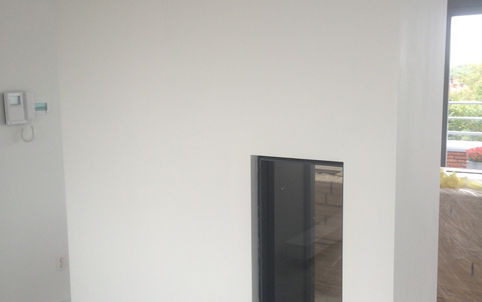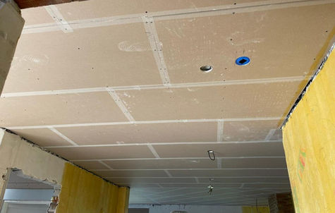 Wat wij doen is we plaatsen gaas op de gipsplaten om ze aan elkaar te bevestigen. Daarna werken we de muren af met een oersterke en gladde pleisterlaag, zodat ze geverfd kunnen worden.